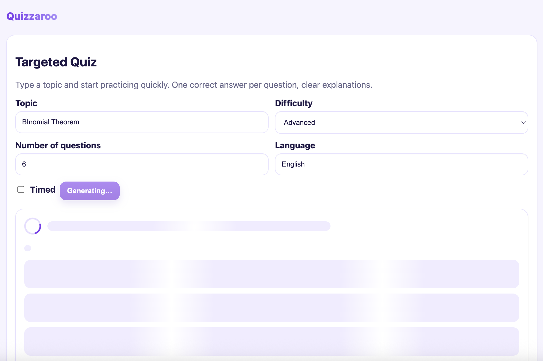 - Hello, Targeted Quiz — learners describe the concept they want to drill (e.g., “Binomial theorem at JEE Advanced difficulty”). Quizzaro calls Azure OpenAI with a JSON-schema prompt, generates questions + distractors, and auto-grades with reasoning. Missed an item? Hit Practice similar to missed and it loops in variations focused on the weak spots.